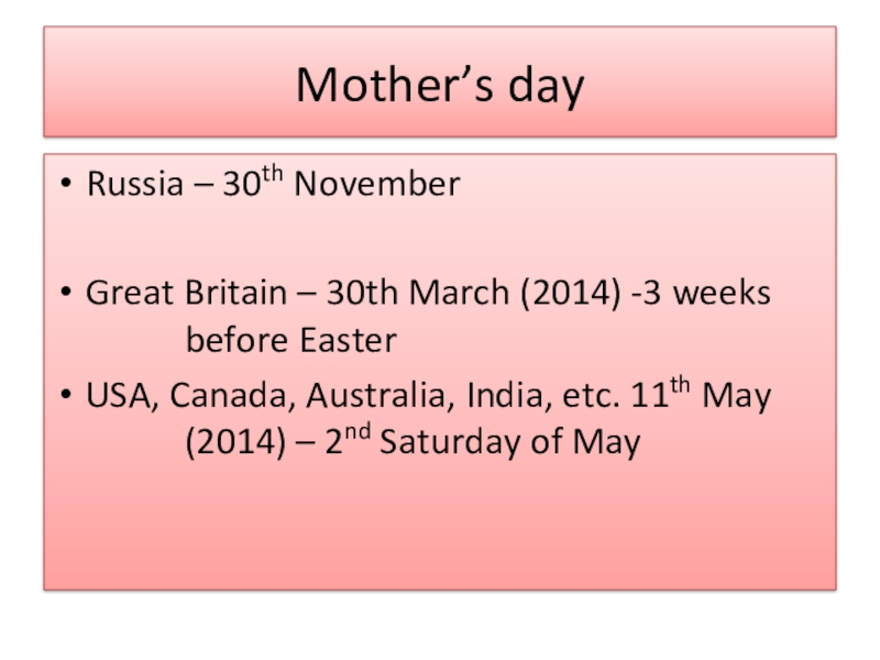 Mother’s dayRussia – 30th NovemberGreat Britain – 30th March (2014) -3 weeks    			before EasterUSA,