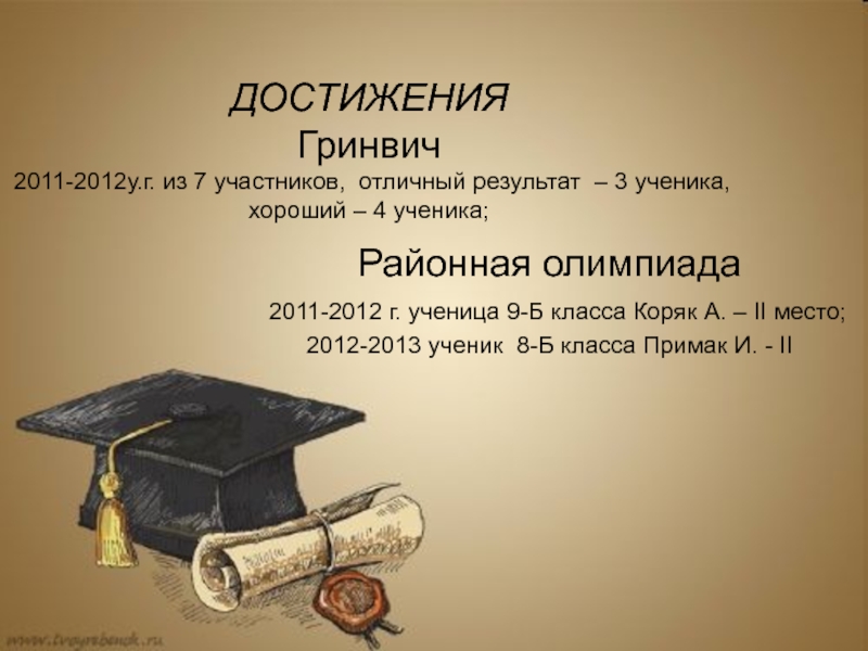2011-2012 г. ученица 9-Б класса Коряк А. – II место;