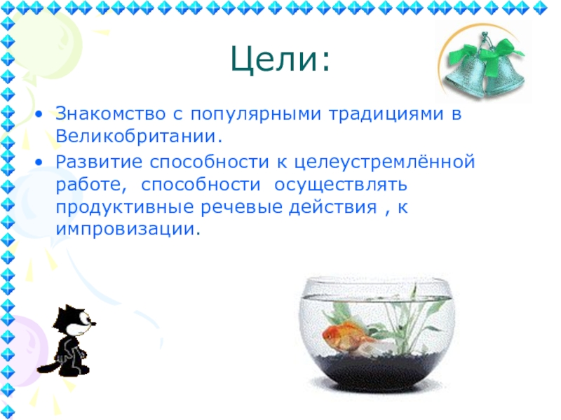 Цели:Знакомство с популярными традициями в Великобритании.Развитие способности к целеустремлённой работе, способности осуществлять продуктивные речевые действия , к