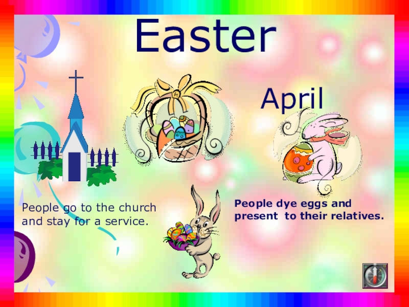 EasterAprilPeople go to the church and stay for a service.People dye eggs and present to their relatives.