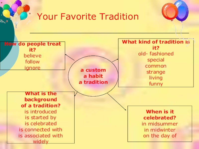 a customa habit a traditionWhat kind of tradition is it?old- fashionedspecialcommonstrangelivingfunnyWhen is it celebrated?in midsummerin midwinteron the