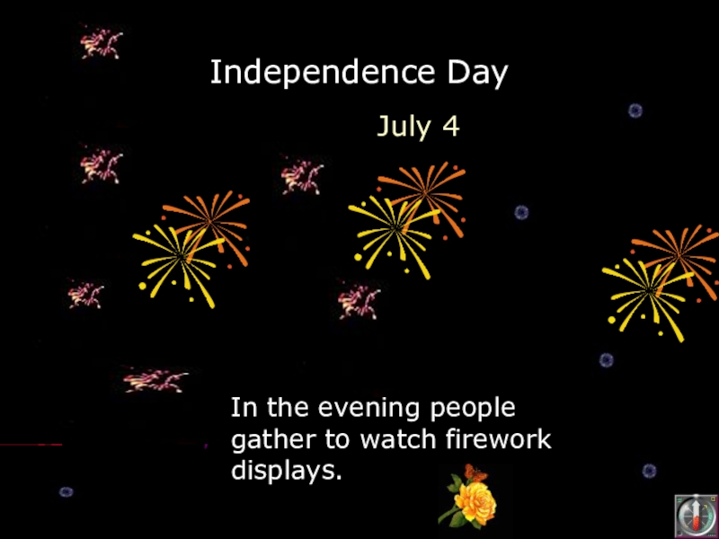 Independence DayJuly 4In the evening people gather to watch firework displays.