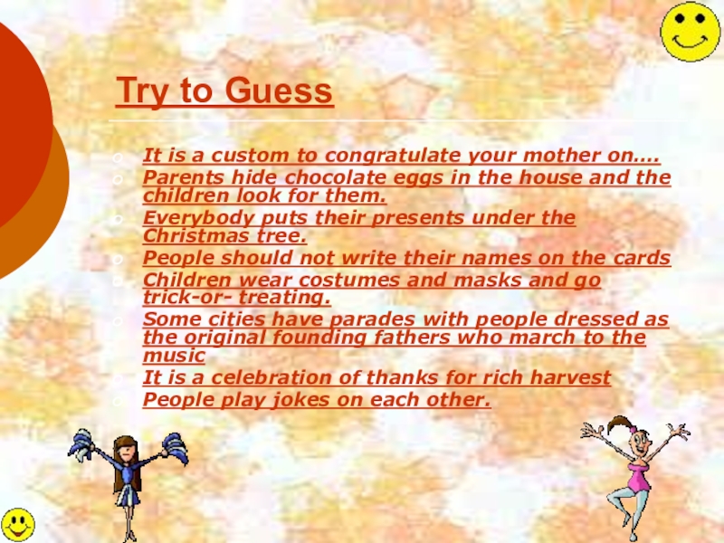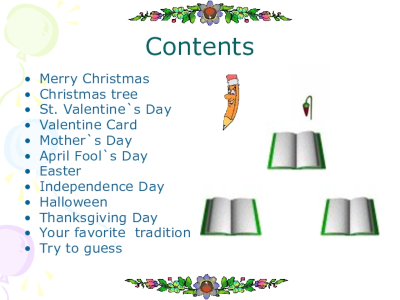 ContentsMerry ChristmasChristmas treeSt. Valentine`s DayValentine CardMother`s DayApril Fool`s DayEasterIndependence DayHalloweenThanksgiving DayYour favorite tradition Try to guess