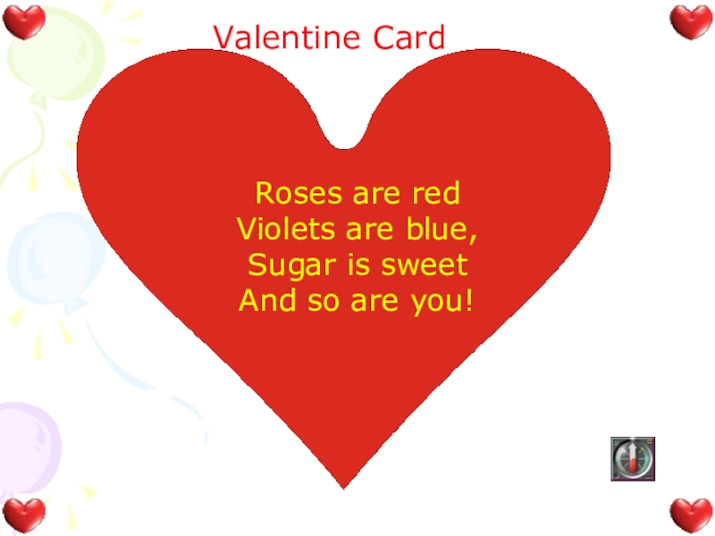 Roses are red Violets are blue, Sugar is sweet And so are you!Valentine Card