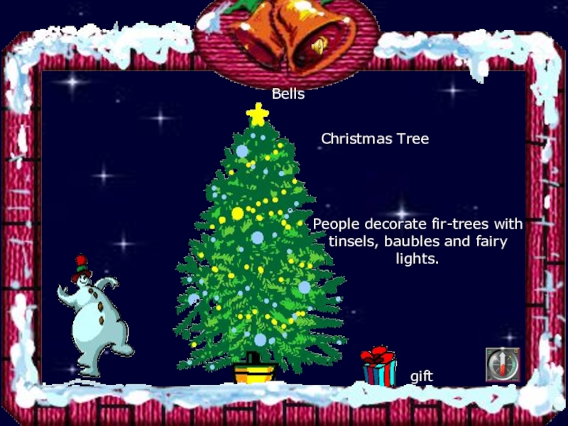Christmas TreeBellsgiftPeople decorate fir-trees with tinsels, baubles and fairy lights.
