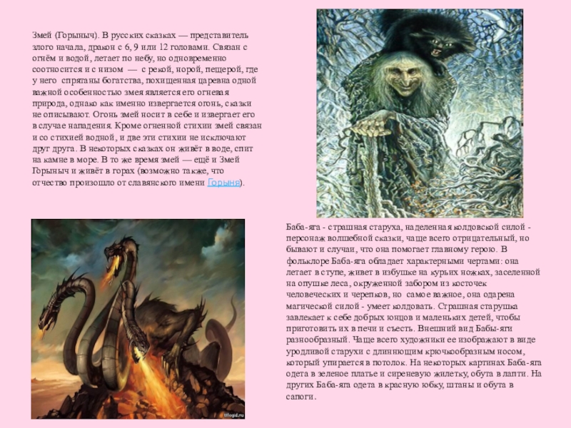 Баба-яга - страшная старуха, наделенная колдовской силой - персонаж волшебной сказки, чаще всего отрицательный, но бывают и случаи, что она помогает главному герою. В фольклоре Баба-яга обладает характерными чертами: она летает в ступе, живет в избушке на курьих ножках, заселенной на опушке леса, окруженной забором из косточек человеческих и черепков, но самое важное, она одарена магической силой - умеет колдовать. Страшная старушка завлекает к себе добрых юнцов и маленьких детей, чтобы приготовить их в печи и съесть. Внешний вид Бабы-яги разнообразный. Чаще всего художники ее изображают в виде уродливой старухи с длиннющим крючкообразным носом, который упирается в потолок. На некоторых картинах Баба-яга одета в зеленое платье и сиреневую жилетку, обута в лапти. На других Баба-яга одета в красную юбку, штаны и обута в сапоги.