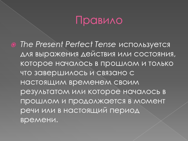 ПравилоThe Present Perfect Tense используется для выражения действия или состояния, которое началось в прошлом и только что завершилось и связано с настоящим временем своим результатом или которое началось в прошлом и продолжается в момент речи или в