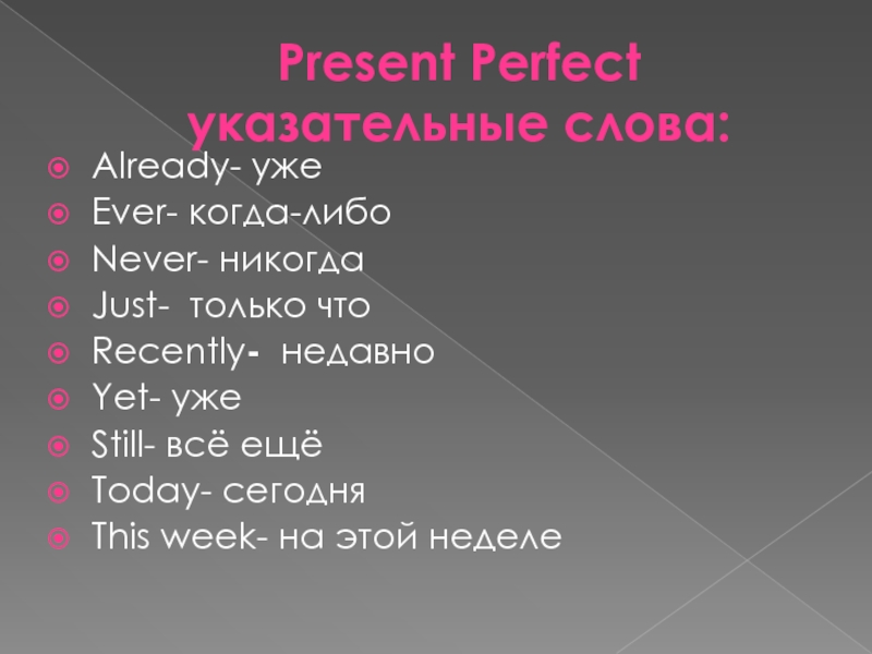 Present Perfect указательные слова:Already- ужеEver- когда-либоNever- никогдаJust- только чтоRecently- недавноYet- ужеStill- всё ещёToday- сегодняThis week- на этой