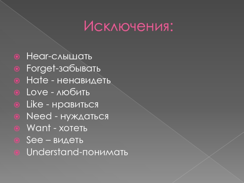 Исключения:Hear-слышатьForget-забыватьHate - ненавидетьLove - любитьLike - нравитьсяNeed - нуждатьсяWant - хотетьSee – видетьUnderstand-понимать