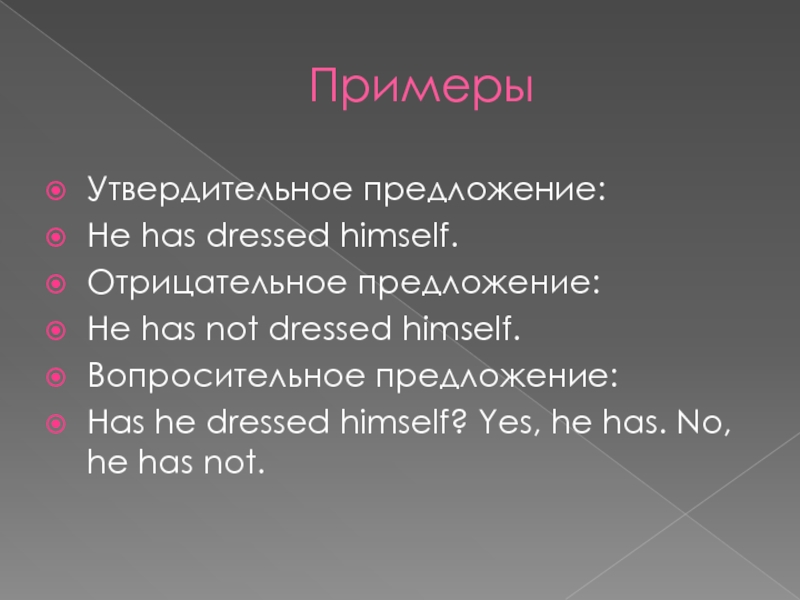 ПримерыУтвердительное предложение:He has dressed himself.Отрицательное предложение:He has not dressed himself.Вопросительное предложение:Has he dressed himself? Yes, he has.