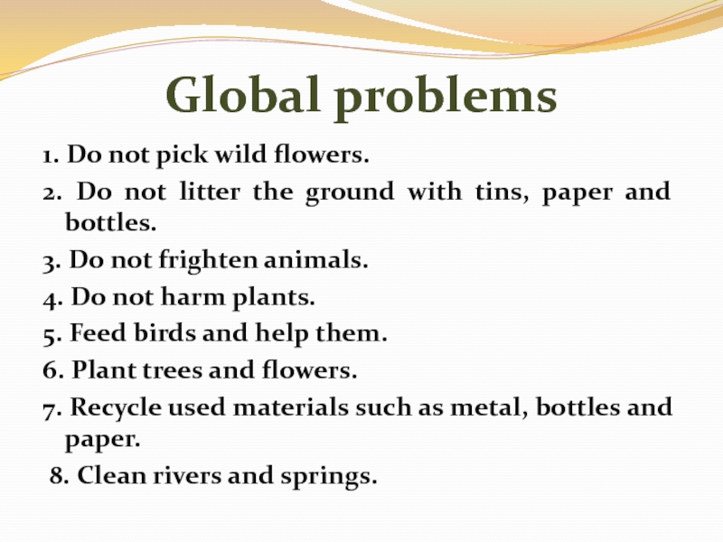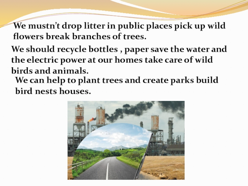 We should recycle bottles , paper save the water and the electric power at our homes take care of wild birds and animals.
