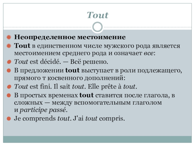 ToutНеопределенное местоимение Tout в единственном числе мужского рода является местоимением среднего рода и означает все:Tout est décidé. — Всё решено.В предложении tout выступает в