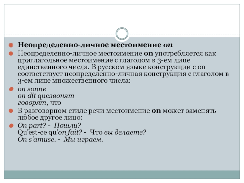 Неопределенно-личное местоимение onНеопределенно-личное местоимение on употребляется как приглагольное местоимение с глаголом в 3-ем лице единственного числа. В русском языке конструкции