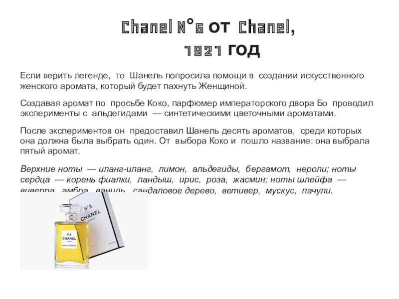 После экспериментов он предоставил Шанель десять ароматов, среди которых она должна была выбрать один. От выбора Коко и пошло название: она выбрала пятый аромат.