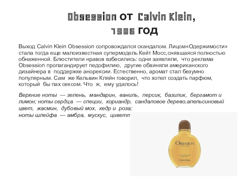 Лицом«Одержимости» стала тогда еще малоизвестная супермодель Кейт Мосс,снявшаяся полностью обнаженной. Блюстители нравов взбесились: одни заявляли, что реклама Obsession пропагандирует педофилию, другие обвиняли американского дизайнера в поддержке анорексии. Естественно, аромат стал безумно популярным. Сам же Кельвин Кляйн говорил, что хотел создать парфюм, который бы пах сексом. Что ж, ему удалось!