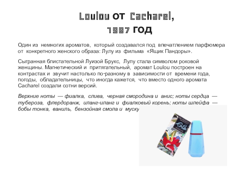 Сыгранная блистательной Луизой Брукс, Лулу стала символом роковой женщины. Магнетический и притягательный, аромат Loulou построен на контрастах и звучит настолько по‑разному в зависимости от времени года, погоды, обладательницы, что иногда кажется, что вместо одного аромата Cacharel создали сотни версий.