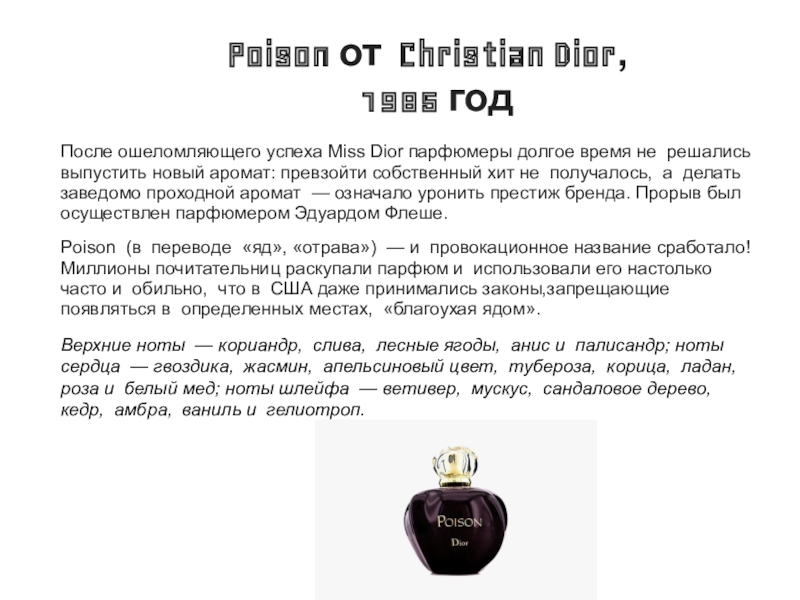 Poison (в переводе «яд», «отрава») — и провокационное название сработало! Миллионы почитательниц раскупали парфюм и использовали его настолько часто и обильно, что в США даже принимались законы,запрещающие появляться в определенных местах, «благоухая ядом».