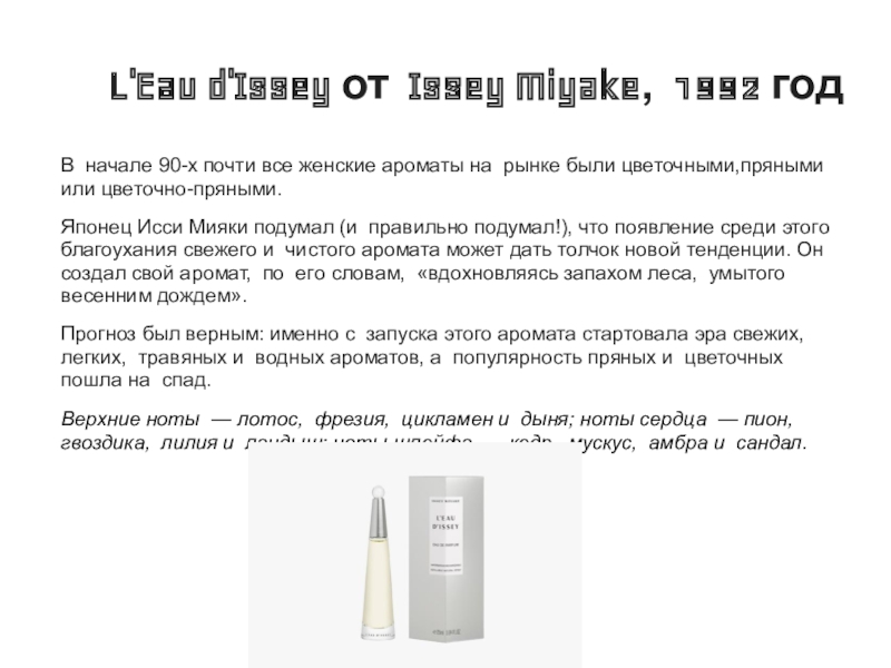 Японец Исси Мияки подумал (и правильно подумал!), что появление среди этого благоухания свежего и чистого аромата может дать толчок новой тенденции. Он создал свой аромат, по его словам, «вдохновляясь запахом леса, умытого весенним дождем».