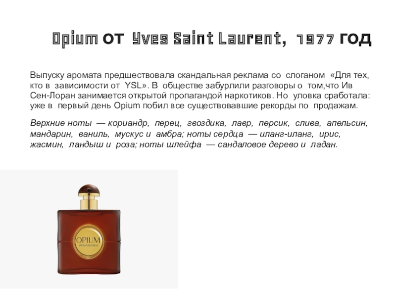 со слоганом «Для тех, кто в зависимости от YSL». В обществе забурлили разговоры о том,что Ив Сен-Лоран занимается открытой пропагандой наркотиков. Но уловка сработала: уже в первый день Opium побил все существовавшие рекорды по продажам.