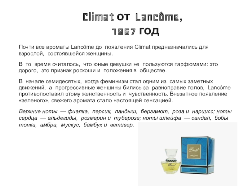 В начале семидесятых, когда феминизм стал одним из самых заметных движений, а прогрессивные женщины бились за равноправие полов, Lancôme противопоставил этому женственность и чувственность. Внезапное появление «зеленого», свежего аромата стало настоящей сенсацией.