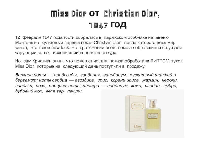 собрались в парижском особняке на авеню Монтень на культовый первый показ Christian Dior, после которого весь мир узнал, что такое new look. На протяжении всего показа собравшиеся ощущали чарующий запах, исходивший непонятно откуда.