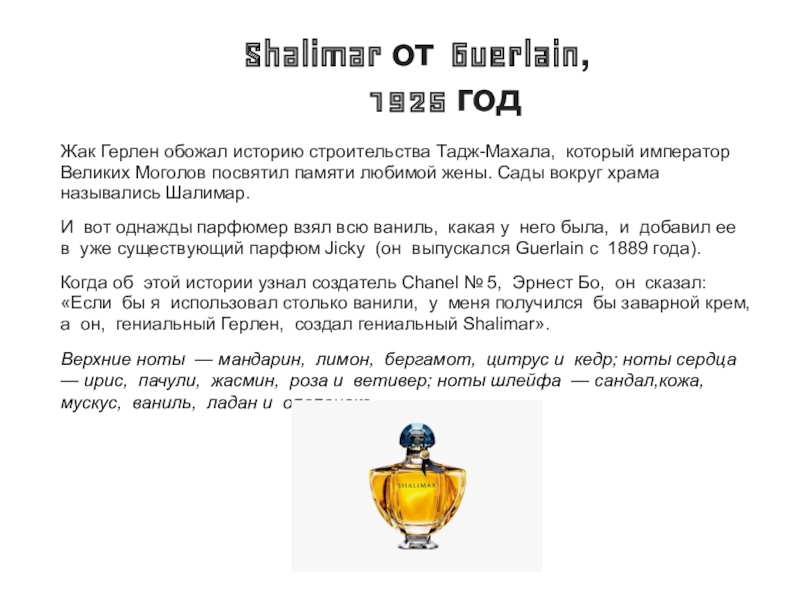 Когда об этой истории узнал создатель Chanel № 5, Эрнест Бо, он сказал: «Если бы я использовал столько ванили, у меня получился бы заварной крем, а он, гениальный Герлен, создал гениальный Shalimar».