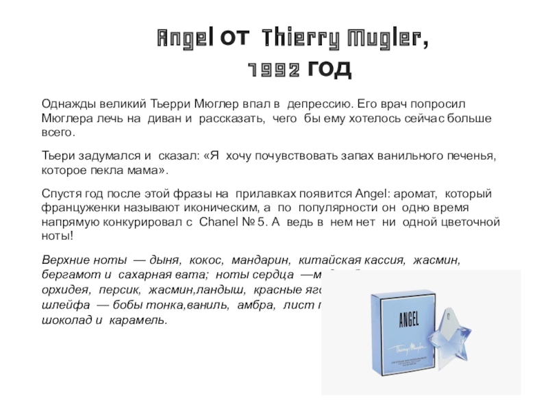 Спустя год после этой фразы на прилавках появится Angel: аромат, который француженки называют иконическим, а по популярности он одно время напрямую конкурировал с Chanel № 5. А ведь в нем нет ни одной цветочной ноты!