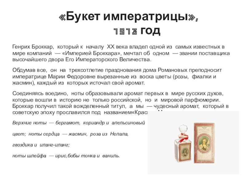 Соединяясь воедино, ноты образовывали аромат первых в мире русских духов, которые вошли в историю не только российской, но и мировой парфюмерии. Броккар получил такой вожделенный титул, а мы — чудесный аромат, который в советскую эпоху прославился под названием«Красная Москва».