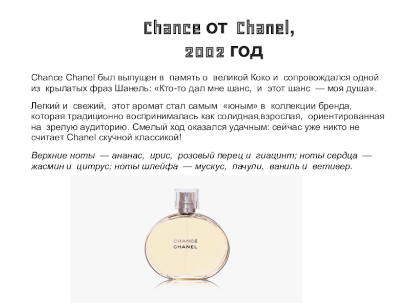 великой Коко и сопровождался одной из крылатых фраз Шанель: «Кто-то дал мне шанс, и этот шанс — моя душа».