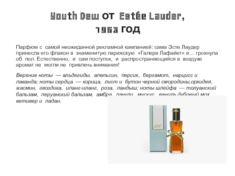 кампанией: сама Эсте Лаудер принесла его флакон в знаменитую парижскую «Галери Лафайет» и… грохнула об пол. Естественно, и сам поступок, и распространяющийся в воздухе аромат не могли не привлечь внимания!