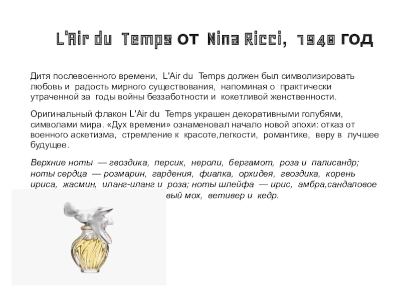 Оригинальный флакон L'Air du Temps украшен декоративными голубями, символами мира. «Дух времени» ознаменовал начало новой эпохи: отказ от военного аскетизма, стремление к красоте,легкости, романтике, веру в лучшее будущее.