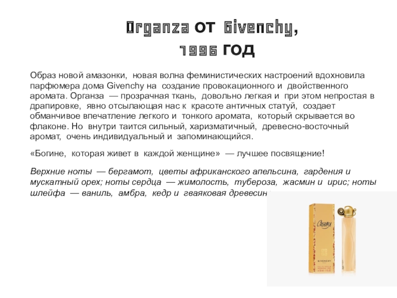 вдохновила парфюмера дома Givenchy на создание провокационного и двойственного аромата. Органза — прозрачная ткань, довольно легкая и при этом непростая в драпировке, явно отсылающая нас к красоте античных статуй, создает обманчивое впечатление легкого и тонкого аромата, который скрывается во флаконе. Но внутри таится сильный, харизматичный, древесно-восточный аромат, очень индивидуальный и запоминающийся.