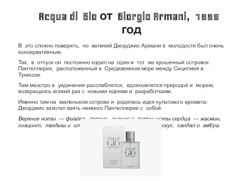 Слайд 18Acqua di Gio от Giorgio Armani, 1996 год