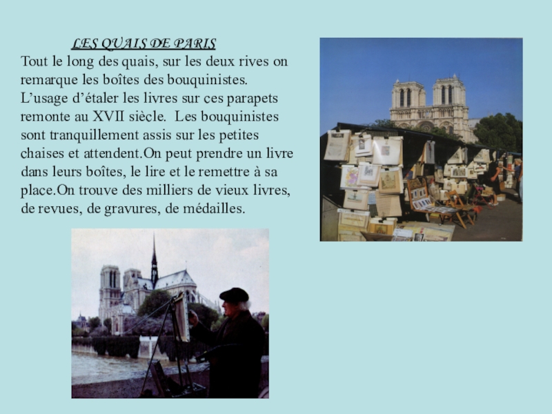 plus célèbre cathédrale, une merveille de l’archithecture gothique (commencée en 1163 et terminée en 1245).Victor Hugo l’a décrit dans son roman historique “Notre-Dame de Paris”. Il disait que les tours rappelaient l’H de son nom . Du haut de сes tours on peut admirer la Seine, ses rives, ses ponts.Les tours sont gardées par les fameuses chimères. Les architectes ont appliqué une nouvelle technique :les arcs en ogive. On a mis beaucoup de vitraux. La rose de Notre-Dame est la plus grande du monde. Notre-Dame mesure 130 m de long, 48 m de large, 35 m de haut. 9000 personnes peuvent y prendre place.