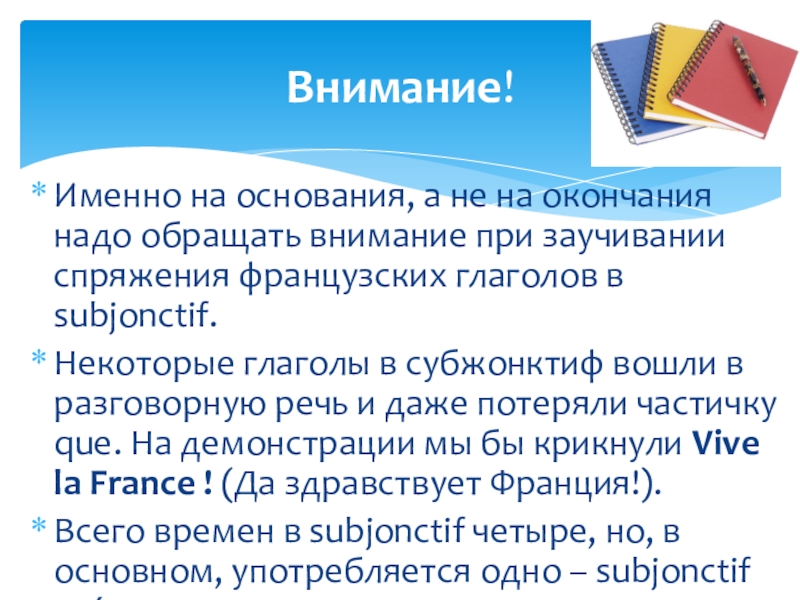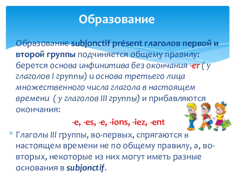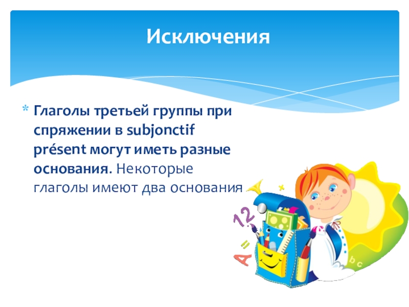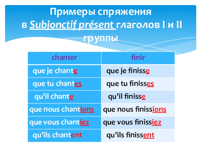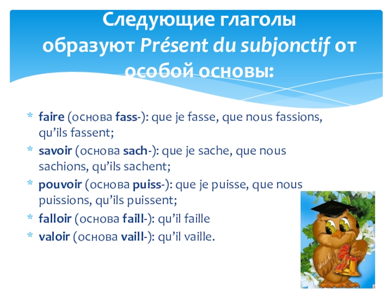 Следующие глаголы образуют Présent du subjonctif от особой основы: