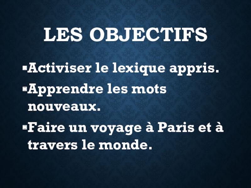 Les objectifsActiviser le lexique appris.Apprendre les mots nouveaux.Faire un voyage à Paris et à travers le monde.