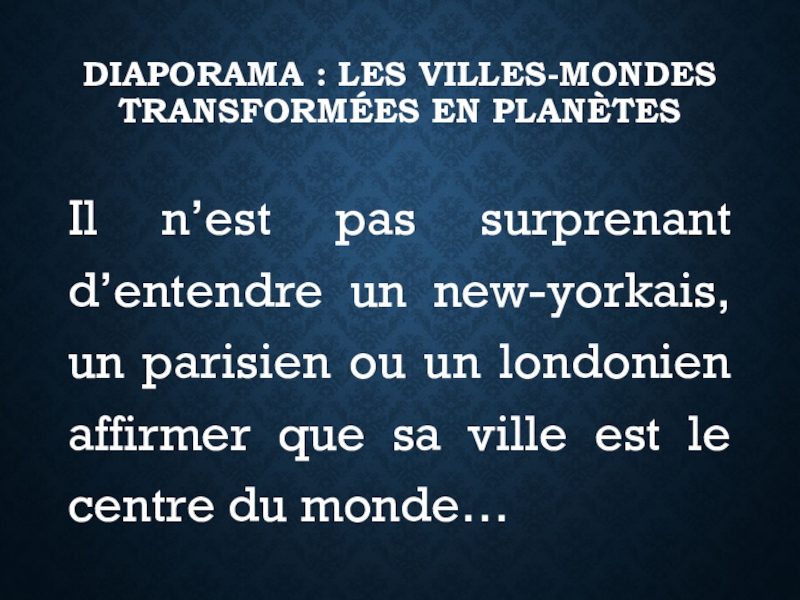 DIAPORAMA : LES VILLES-MONDES TRANSFORMÉES EN PLANÈTES Il n’est pas surprenant d’entendre un new-yorkais, un parisien ou