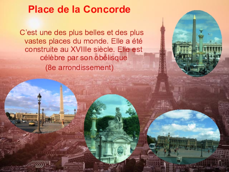 Place de la Concorde  C’est une des plus belles et des plus vastes places du monde.