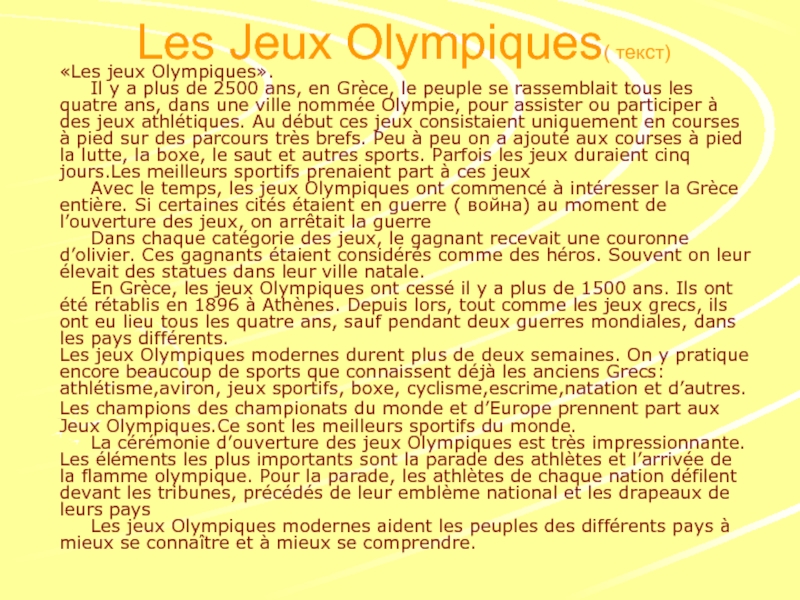Avec le temps, les jeux Olympiques ont commencé à intéresser la Grèce entière. Si certaines cités étaient en guerre ( война) au moment de l’ouverture des jeux, on arrêtait la guerre