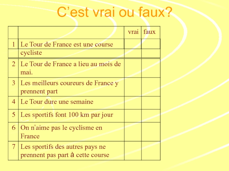 sportive la plus célébre, c’est aussi un grand spectacle à travers la France. Ce sont les plus importantes courses cyclistes du monde. Elles ont lieu au mois de juillet. Alors les Français voient passer les meilleurs coureurs de France et du monde entier. Cette compétition est très populaire en France, pays du cyclisme. La course a lieu par étape. Elle passe par de très belles provinces: l’Alzace, la Provence, la Bretagne. Les coureurs traversent les montagnes les plus hautes: les Alpes, les Pyrénées. le Tour de France,dure 3 semaines. Les coureurs parcourent 4000 à 5000 kilomètres. Il font chaque jour 200 ou 300 kilomètres. On les appelle «les Géants de la route»(гиганты дороги). Les Français aiment suivre «les Géants de la route». Ils les regardent par la télévision. Des familles entières écoutent la radio.