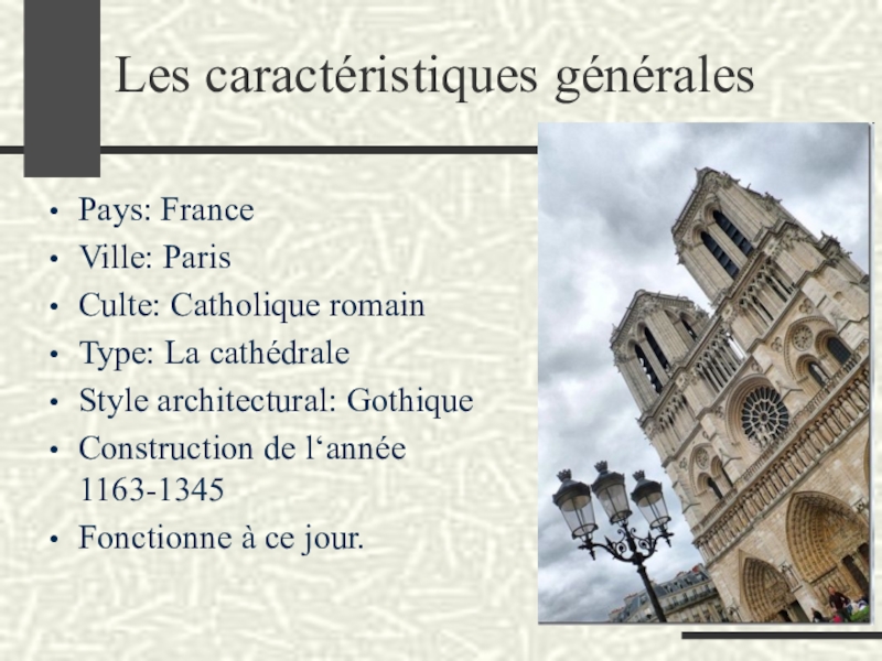 Les caractéristiques généralesPays: FranceVille: ParisCulte: Catholique romainType: La cathédraleStyle architectural: GothiqueConstruction de l‘année 1163-1345Fonctionne à ce jour.