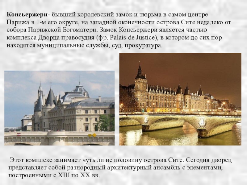 Этот комплекс занимает чуть ли не половину острова Сите. Сегодня дворец представляет собой разнородный архитектурный ансамбль с элементами, построенными с XIII по XX вв.