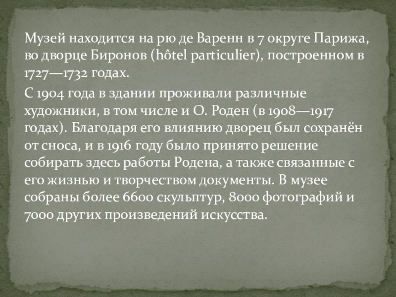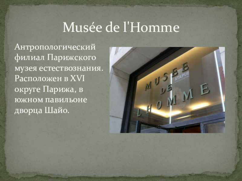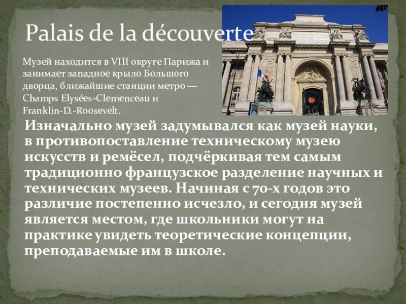 Музей находится в VIII округе Парижа и занимает западное крыло Большого дворца, ближайшие станции метро — Champs Elysées-Clemenceau и Franklin-D.-Roosevelt.