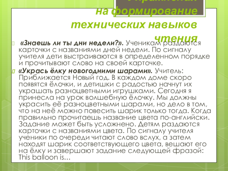 «Укрась ёлку новогодними шарами». Учитель: Приближается Новый год. В каждом доме скоро появятся ёлочки, и детишки с радостью начнут их украшать разноцветными игрушками. Сегодня я принесла на урок волшебную ёлочку. Мы должны украсить её разноцветными шарами, но дело в том, что на неё можно повесить шарик только тогда. Когда правильно прочитаешь название цвета по-английски. Задание может быть усложнено. Детям раздаются карточки с названиями цвета. По сигналу учителя ученики по очереди читают слово вслух, а затем находят шарик соответствующего цвета, вешают его на ёлку и завершают задание следующей фразой: This balloon is…