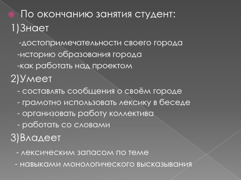 По окончанию занятия студент:1)Знает  -достопримечательности своего города  -историю образования города  -как работать над проектом2)Умеет