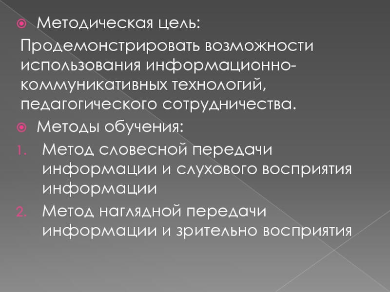 Методическая цель:Продемонстрировать возможности использования информационно-коммуникативных технологий, педагогического сотрудничества.Методы обучения:Метод словесной передачи информации и слухового восприятия информацииМетод наглядной