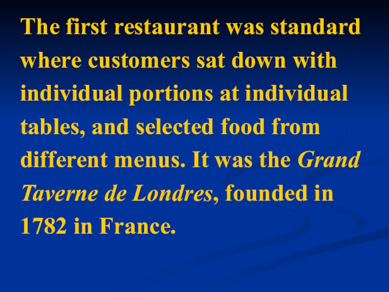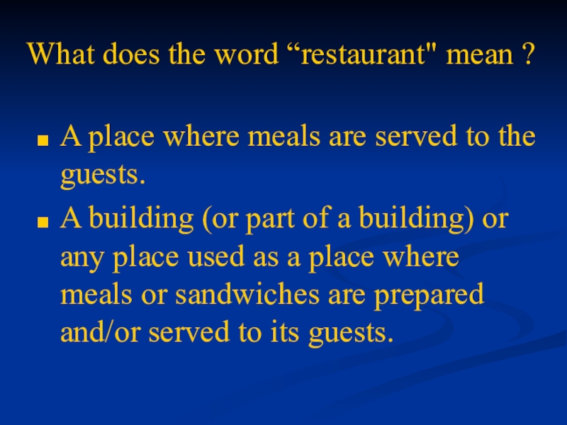 A restaurant prepares and serves food and drink to customers. Meals are generally