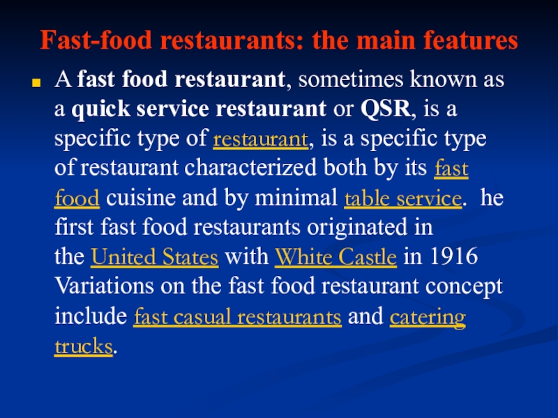 service restaurant or QSR, is a specific type of restaurant, is a specific type of restaurant characterized both by its fast food cuisine and by minimal table service. he first fast food restaurants originated in the United States with White Castle in 1916 Variations on the fast food restaurant concept include fast casual restaurants and catering trucks.