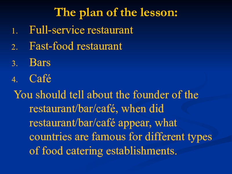 founder of the restaurant/bar/café, when did restaurant/bar/café appear, what countries are famous for different types of food catering establishments.