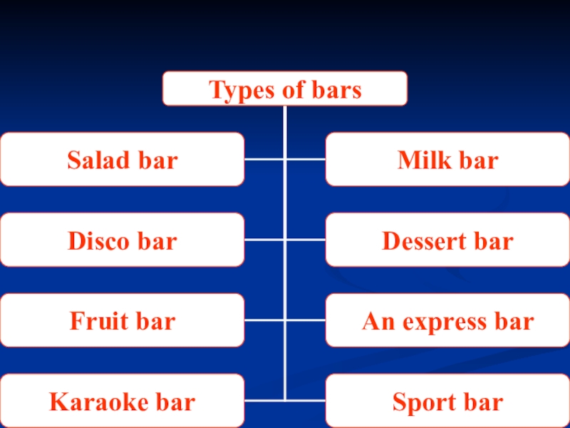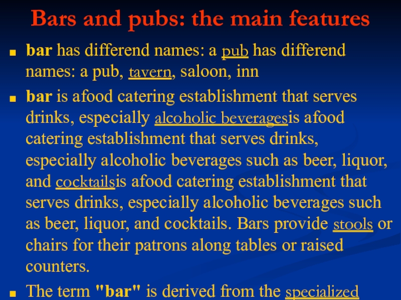 bar is afood catering establishment that serves drinks, especially alcoholic beveragesis afood catering establishment that serves drinks, especially alcoholic beverages such as beer, liquor, and cocktailsis afood catering establishment that serves drinks, especially alcoholic beverages such as beer, liquor, and cocktails. Bars provide stools or chairs for their patrons along tables or raised counters.